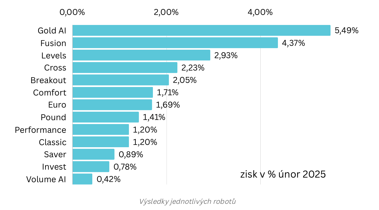 Lednový rozjezd roku 2025 byl opravdu velmi pomalý a leden skončil trochu za naším očekáváním. Poslední týden ovšem dává tušit, že následující týdny už bychom se měli dostávat do taktu a s tím přijdou i lepší výsledky. Přesto jsou průměrné zisky u kombinací robotů většiny našich uživatelů převyšující 2% za měsíc v tak slabém měsíci jakým byl leden pořád pěkným výsledkem.