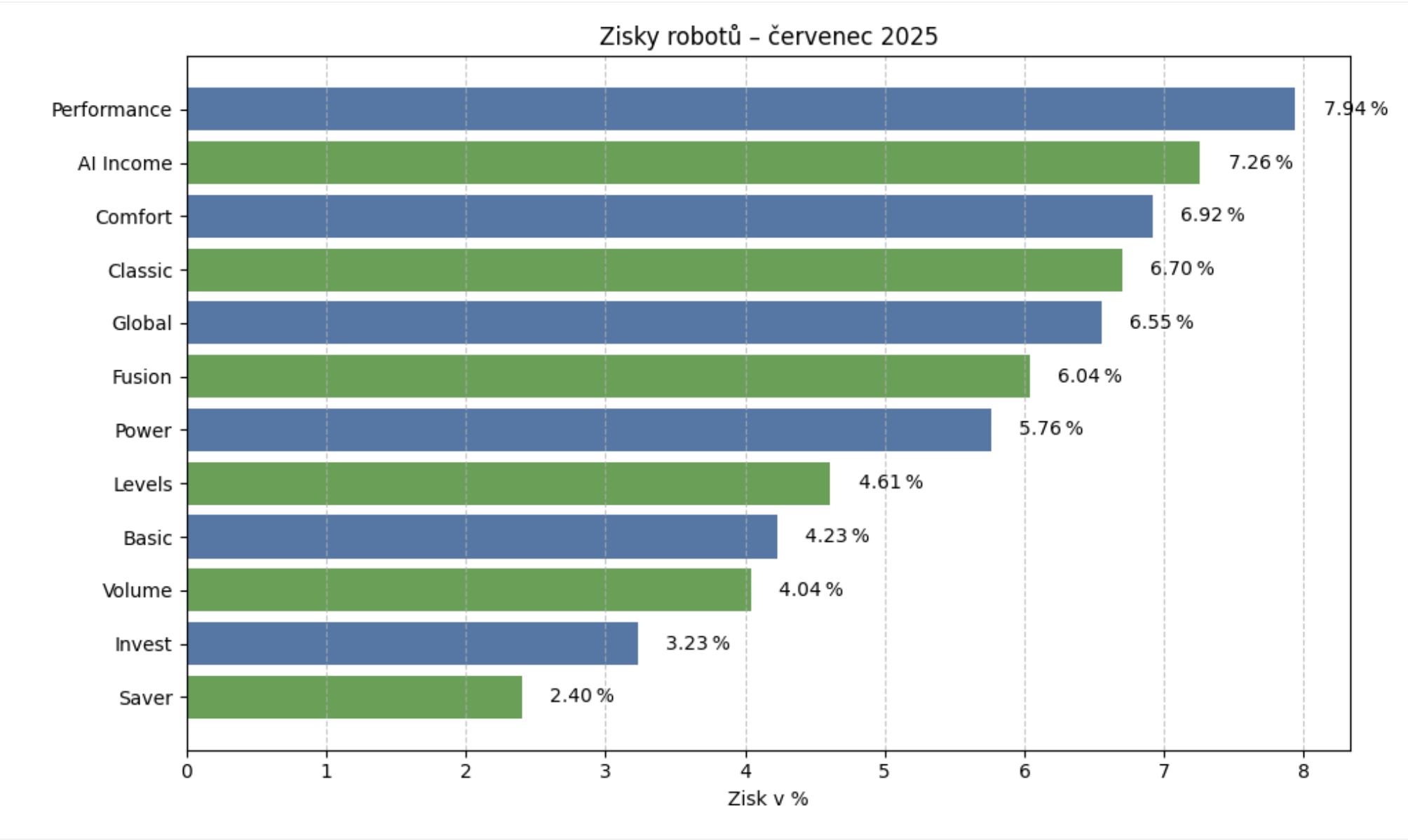 Naše algoritmy však zůstaly stabilní. Výsledky za červenec potvrzují odolnost systému, zejména u diverzifikovaných strategií bez přímé expozice na USD.